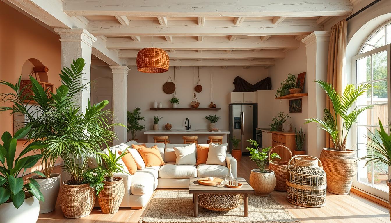Natürliche Materialien wie Terrakotta, Holz und Leinen schaffen das typische mediterrane Ambiente. Diese Elemente verwandeln jeden Raum in eine Oase der Ruhe. Bast und andere organische Texturen ergänzen das harmonische Gesamtbild perfekt.